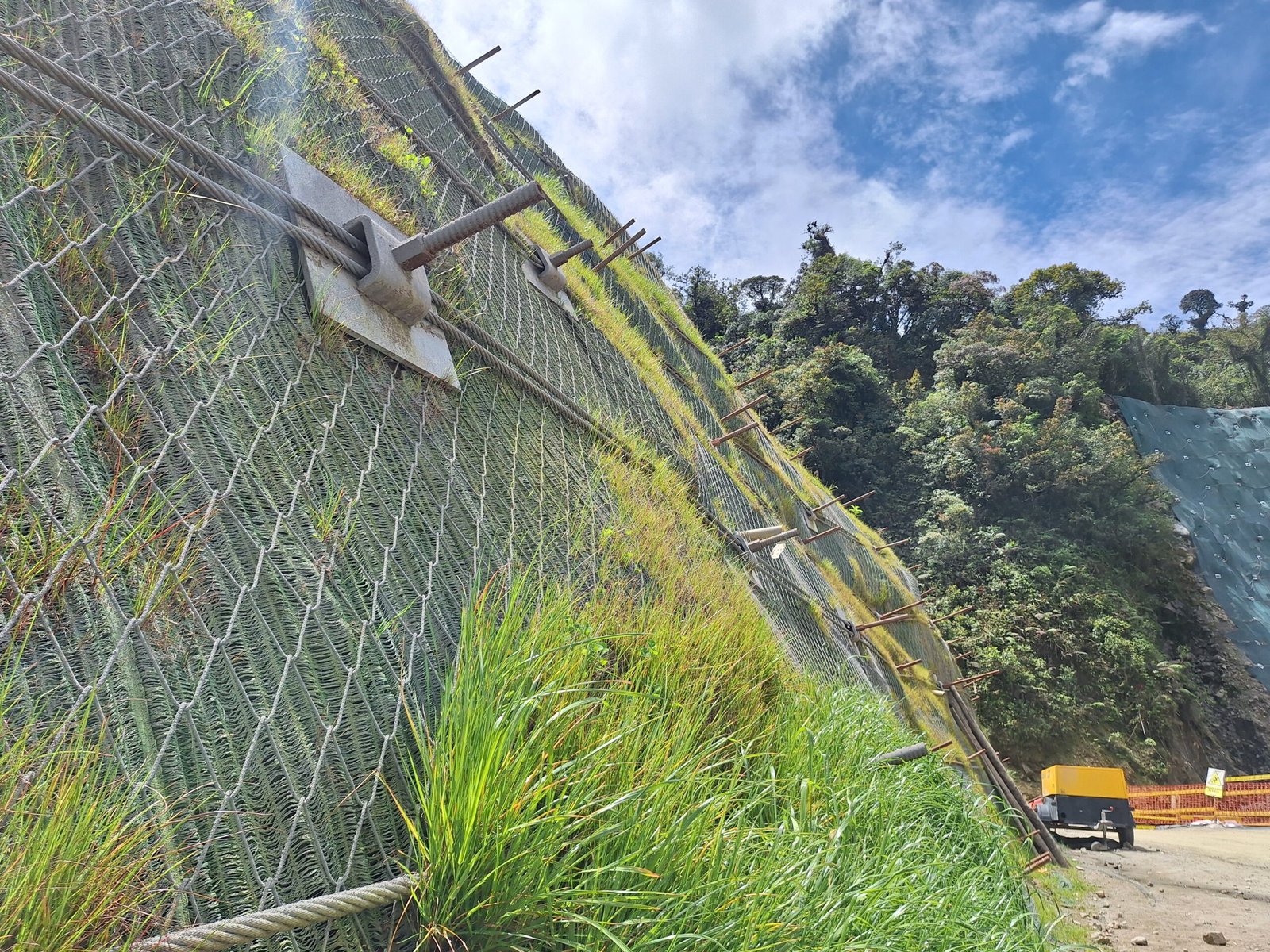 En taludes de cuarzomonzodiorita con meteorización esferoidal, altas pendientes y fuerte pluviosidad, se adoptó el sistema TECCO® con malla de acero de alta resistencia, anclajes activos y vigas flexibles. Se han ejecutado 20.000 m² para optimizar la estabilización de taludes y el manejo de aguas.